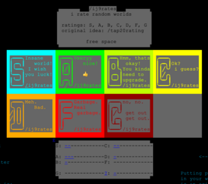 A tradition started by Tap20 in 2021, where users would leave letter ratings on the worlds they visit.