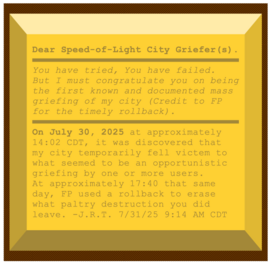Created on September 11th, 2024 in /main. The city is located at X: 299792458, Y: 299792458, in reference to the actual speed of light.