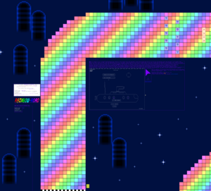 Various staples of Spawn, including: The Void, griefing, JRT himself, The Crawler, the Center Console, FP, The Carrion, anons, PKK and lime.owot's radio. The OWOT Discord is also represented, along with the art world /main. Rscr, a prolific screenshotter, is portrayed as a satellite.
