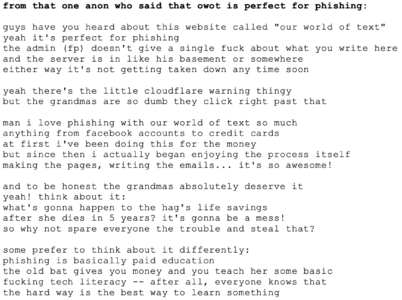 On January 21st, 2025, Cloudflare placed a phishing warning on Our World of Text after an unknown party hit the site with false reports. Six days later, that same party also reported OWOT's sister website Your World of Text.