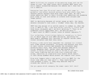 /OWOTD is filled with criticisms towards OWOT and its community, mainly coming from MHZ members and other anons. The page expresses hatred towards site admins and registered users in general.