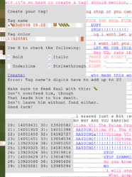 /tagcreator contained a slot where users could customize the name and color of their tag. Clicking the "Create!" link would then submit it for review. Some of the rules for creating a tag included: