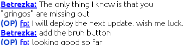 | December 30th, 2023 | FP has deployed an update, resetting the server's uptime of 42 days. FP has disabled the chat for an hour due to the depressing state of it. Submitted by @lime.cat@justanotherinternetguy gets @Scripter on Day 2 of being in this server. |