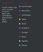 ............. The @Scripter role has been moved down the role ladder, causing some users' top role's colors to be changed to dark blue and yellow.