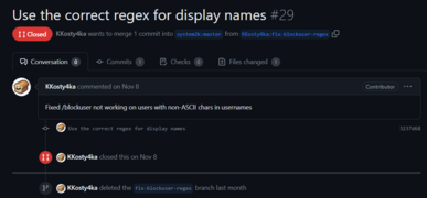 | November 8th, 2023 | @s makes a pull request to OWOT's code, changing the regex for blocking to support display names. https://github.com/system2k/NodeWorldOfText/pull/28