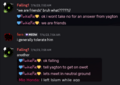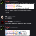 Fern expressed strong distaste towards Pinkiepie but acknowledged that he was an interesting person to talk to. Pinkiepie, on the other hand, seemed to be strangely obsessed with Fern, who was known as Yagton at the time.
