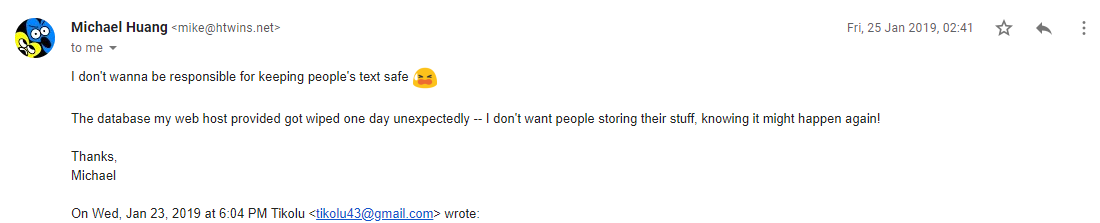 - ↑ Huang, Michael (2019-01-25). "I don't wanna be responsible for keeping people's text safe". Retrieved 2025-10-04.