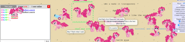 This world's chat showcases a feature where admins can embed files in chat messages. It also contains a button that users can click to activate a browser pony script.