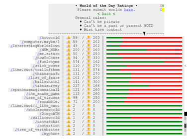 A World of the Day (WOTD or WotD) is a featured world in the Center Console that is determined by the Ratings poll. Despite the name, WOTDs last longer than a day, with recent years[when?] seeing WOTDs that remain for weeks on end. A world can only be WOTD once and cannot be private, unless the world is a WIP. A list of all WOTDs can be found at /wotd. Worlds can be requested at /fp/submit to get added to the poll so they can become a WOTD.